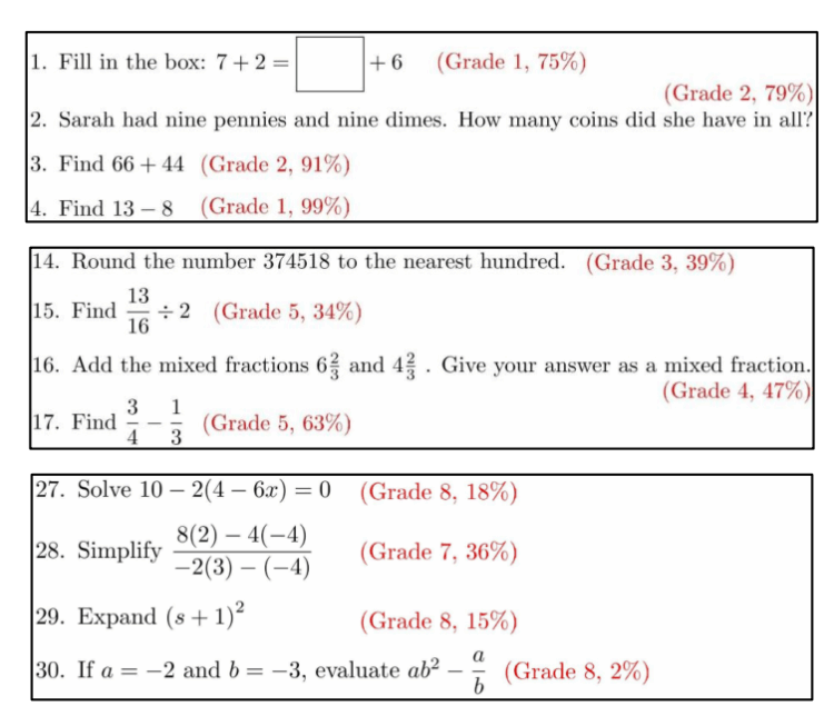 Some examples of remedial class material and the percentage of remedial students getting the answers correct. |