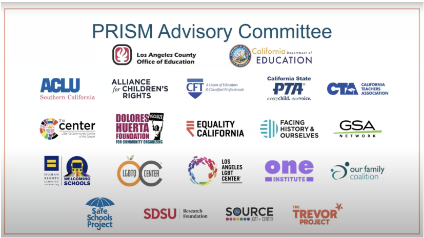 CDE contracted with the Los Angeles County Office of Education to develop the Providing Relevant Inclusive Support that Matters for LGBTQ+ Students (PRISM) program. PRISM is a six-course online training with content targeted to certificated educators to provide resources to bolster support for LGBTQ+ youth in California. These courses are available for free, and hosted in a learning management system, starting July 1, 2025. Visit the PRISM website to learn more.