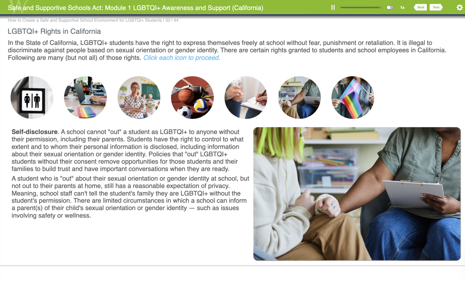 | LGBTQ+ cultural competency training is required for all teachers and other certificated employees serving pupils in grades seven through twelve. More specifically, beginning with the 2025–26 school year, and continuing through the 2029–30 school year, a local educational agency (LEA) serving pupils in any of grades seven through twelve must provide and require at least one hour of LGBTQ+ cultural competency training annually. |